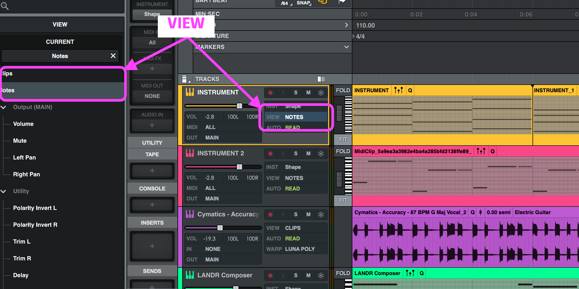 - トラック名のすぐ下あたりにある小さな文字(デフォルトでは「Clips」や「Notes」)をクリックします。